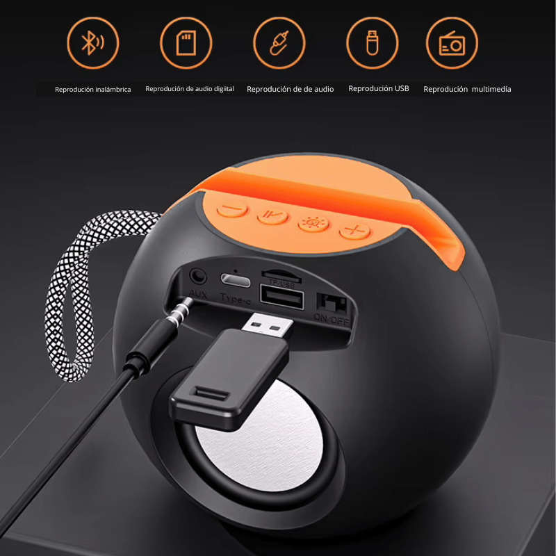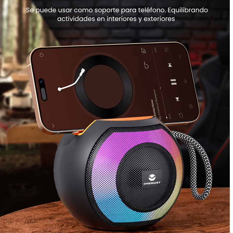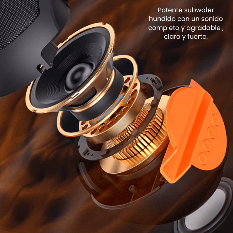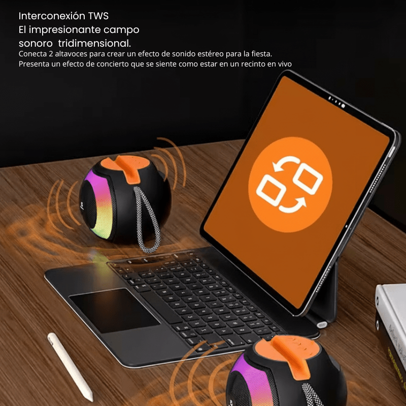 Fabricado con carcasa de **PVC resistente**, y con certificación de impermeabilidad, es perfecto para acompañarte en salidas, camping, o actividades al aire libre. Su conectividad por **inducción** permite un emparejamiento simple y sin cables, brindando una experiencia de uso sin complicaciones. Además, incluye soporte tipo cuerda para colgar y transportar fácilmente.